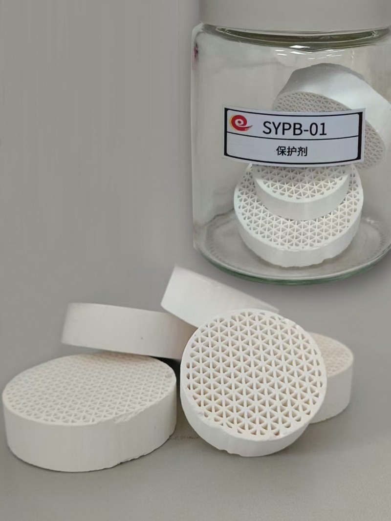 SYPB-01為蜂窩鳥巢結構的保護劑,具有高空隙率和床層截面流通面積,比瓷球高80%-100%,為降低壓降創造條件。處理含雜質原料時提供優異的物料分配和攔截容納雜質能力。